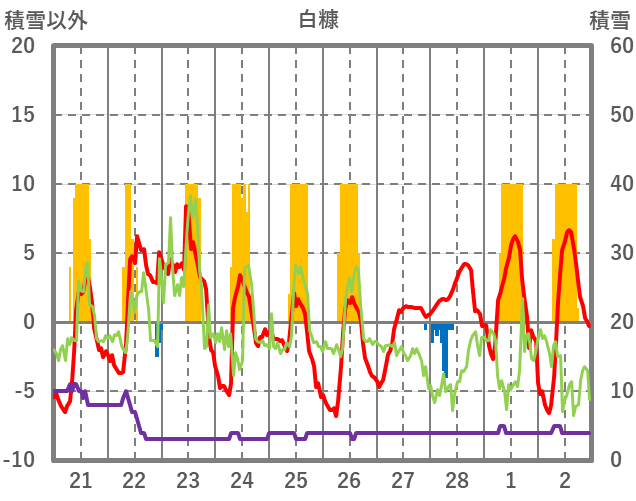 | 日 | 時 | 気温 | 降水 | 風向/風速 | 日照 | 積雪 | 降雪 |