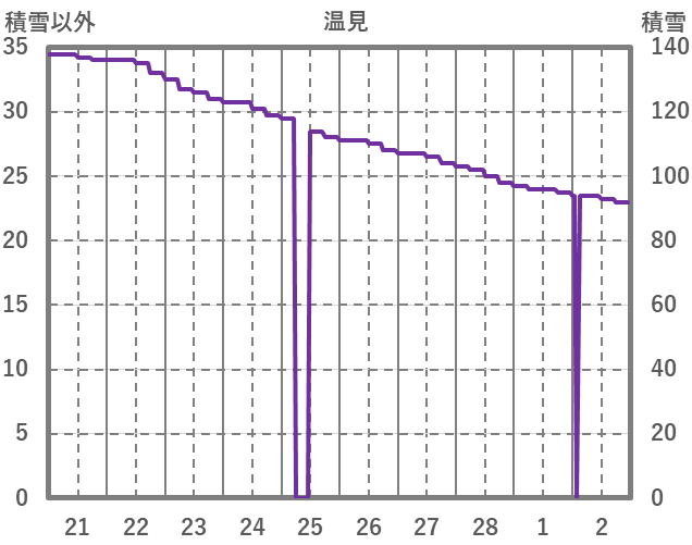 | 日 | 時 | 気温 | 降水 | 風向/風速 | 日照 | 積雪 | 降雪 |
