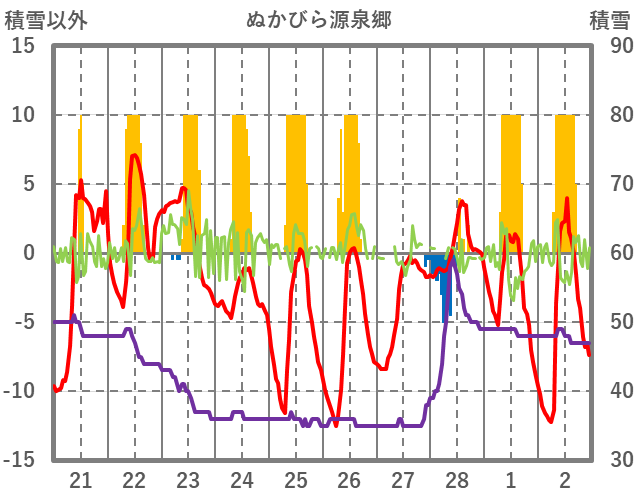 | 日 | 時 | 気温 | 降水 | 風向/風速 | 日照 | 積雪 | 降雪 |