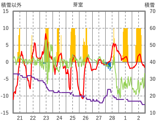 | 日 | 時 | 気温 | 降水 | 風向/風速 | 日照 | 積雪 | 降雪 |
