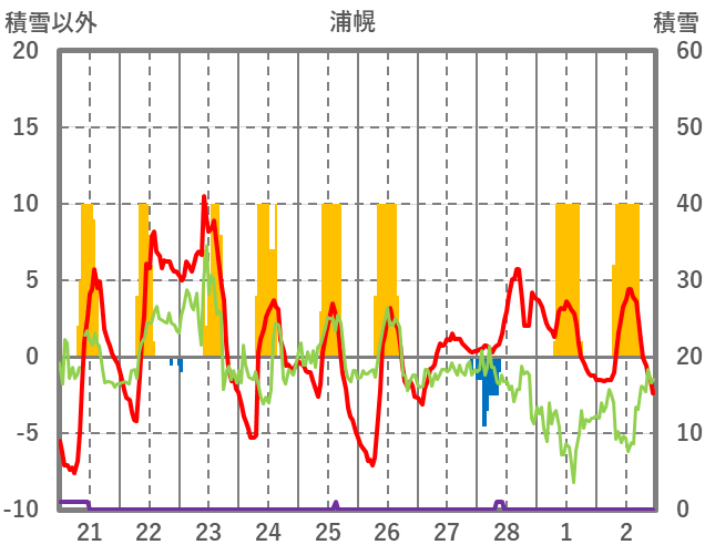 | 日 | 時 | 気温 | 降水 | 風向/風速 | 日照 | 積雪 | 降雪 |