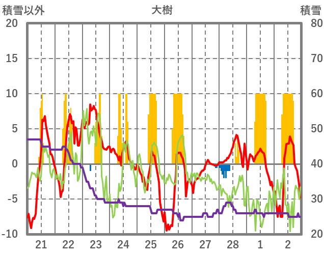 | 日 | 時 | 気温 | 降水 | 風向/風速 | 日照 | 積雪 | 降雪 |