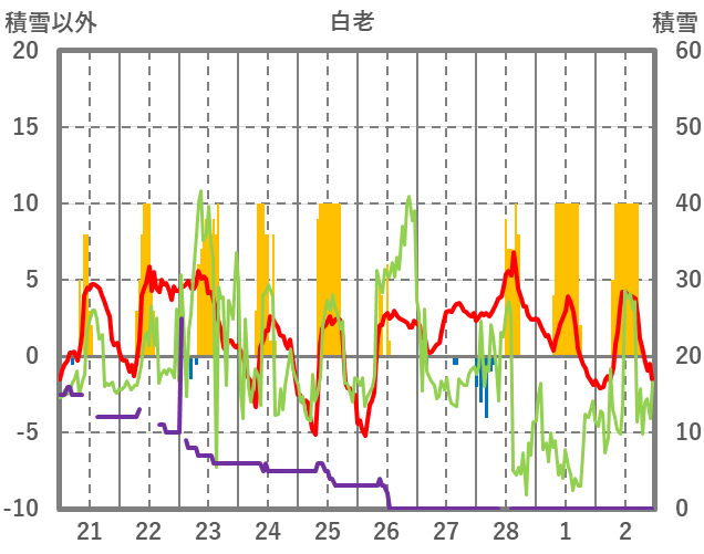 | 日 | 時 | 気温 | 降水 | 風向/風速 | 日照 | 積雪 | 降雪 |