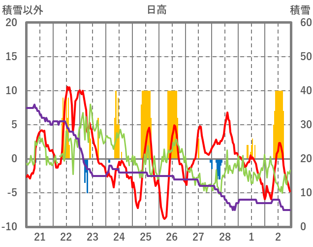 | 日 | 時 | 気温 | 降水 | 風向/風速 | 日照 | 積雪 | 降雪 |