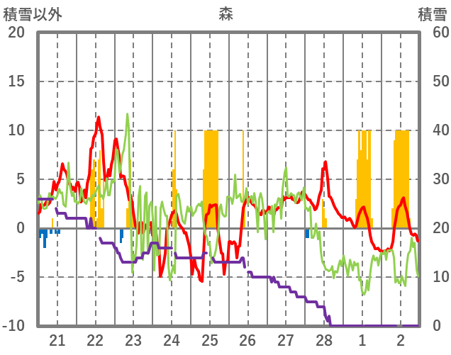 | 日 | 時 | 気温 | 降水 | 風向/風速 | 日照 | 積雪 | 降雪 |