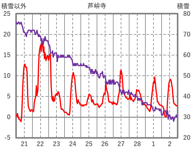| 日 | 時 | 気温 | 降水 | 風向/風速 | 日照 | 積雪 | 降雪 |