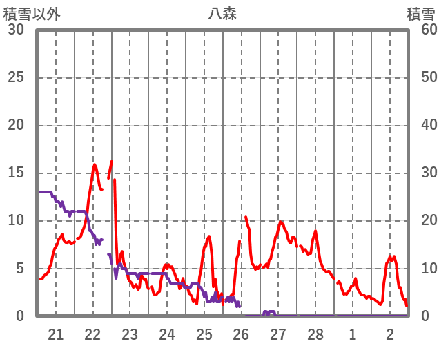 | 日 | 時 | 気温 | 降水 | 風向/風速 | 日照 | 積雪 | 降雪 |