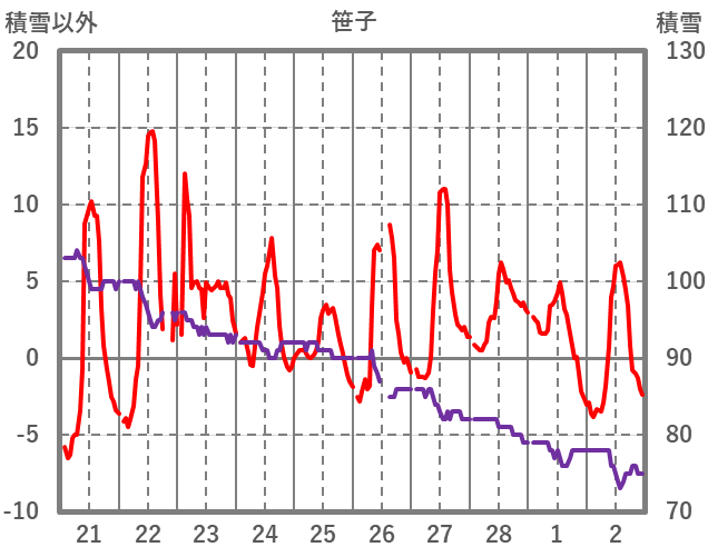 | 日 | 時 | 気温 | 降水 | 風向/風速 | 日照 | 積雪 | 降雪 |