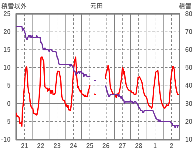 | 日 | 時 | 気温 | 降水 | 風向/風速 | 日照 | 積雪 | 降雪 |