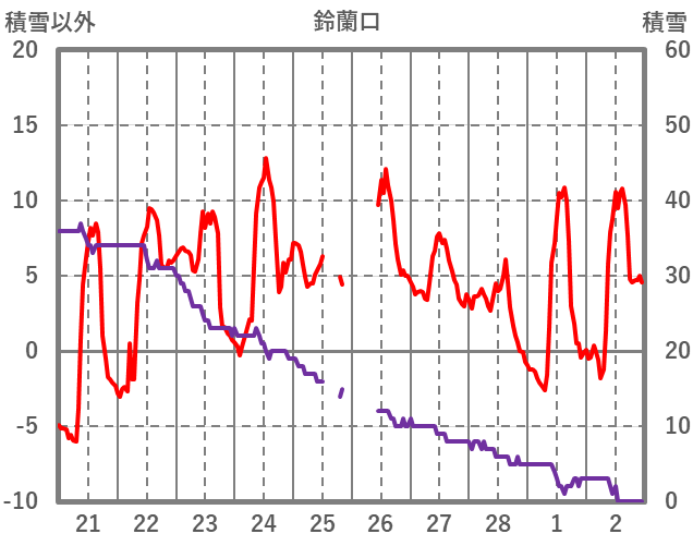 | 日 | 時 | 気温 | 降水 | 風向/風速 | 日照 | 積雪 | 降雪 |