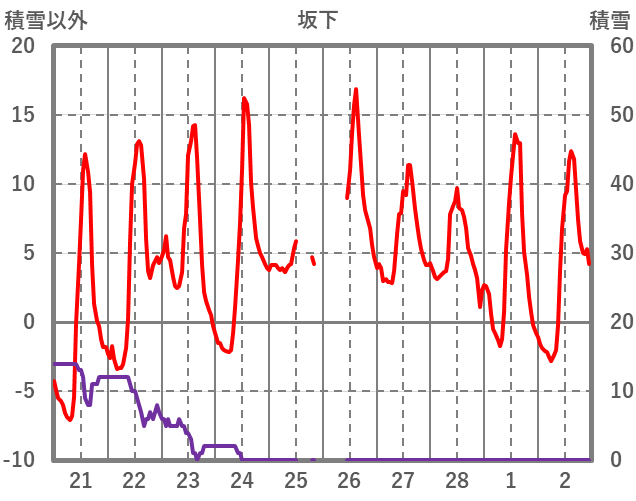 | 日 | 時 | 気温 | 降水 | 風向/風速 | 日照 | 積雪 | 降雪 |