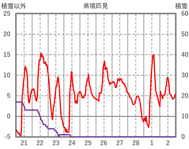 | 日 | 時 | 気温 | 降水 | 風向/風速 | 日照 | 積雪 | 降雪 |