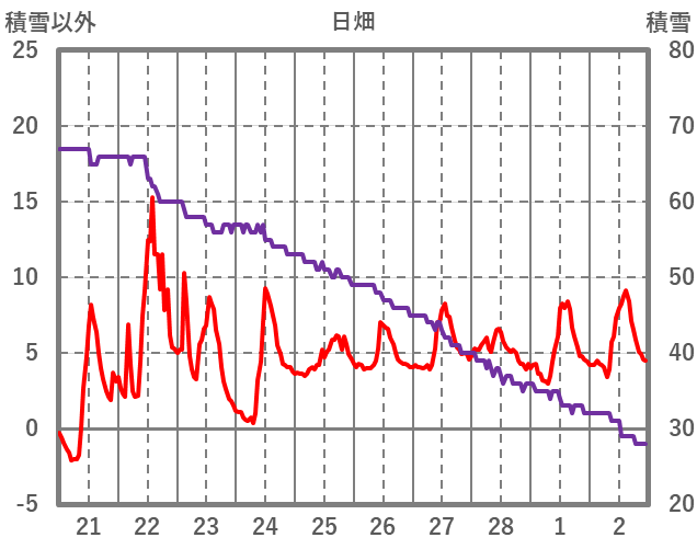 | 日 | 時 | 気温 | 降水 | 風向/風速 | 日照 | 積雪 | 降雪 |