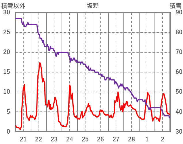 | 日 | 時 | 気温 | 降水 | 風向/風速 | 日照 | 積雪 | 降雪 |