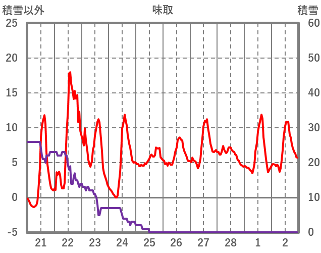 | 日 | 時 | 気温 | 降水 | 風向/風速 | 日照 | 積雪 | 降雪 |