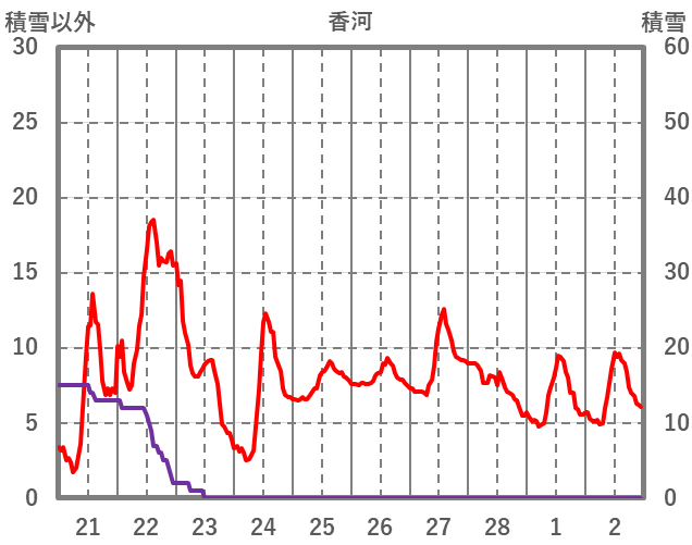 | 日 | 時 | 気温 | 降水 | 風向/風速 | 日照 | 積雪 | 降雪 |