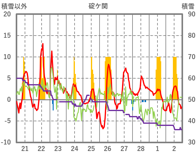 | 日 | 時 | 気温 | 降水 | 風向/風速 | 日照 | 積雪 | 降雪 |
