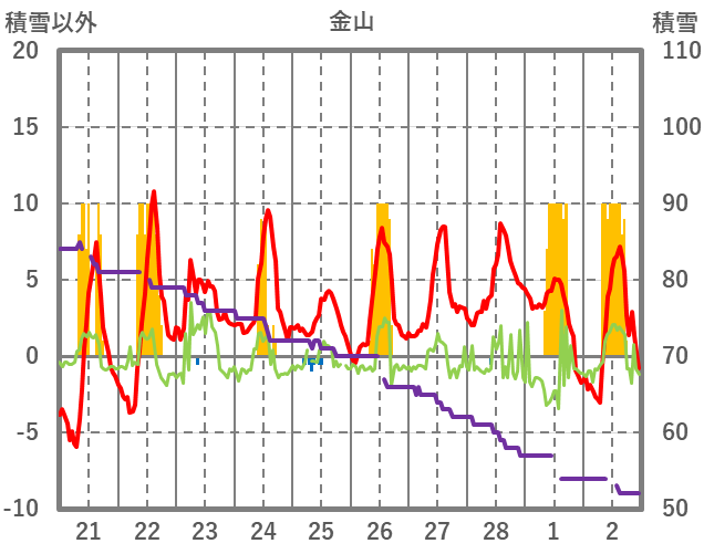 | 日 | 時 | 気温 | 降水 | 風向/風速 | 日照 | 積雪 | 降雪 |