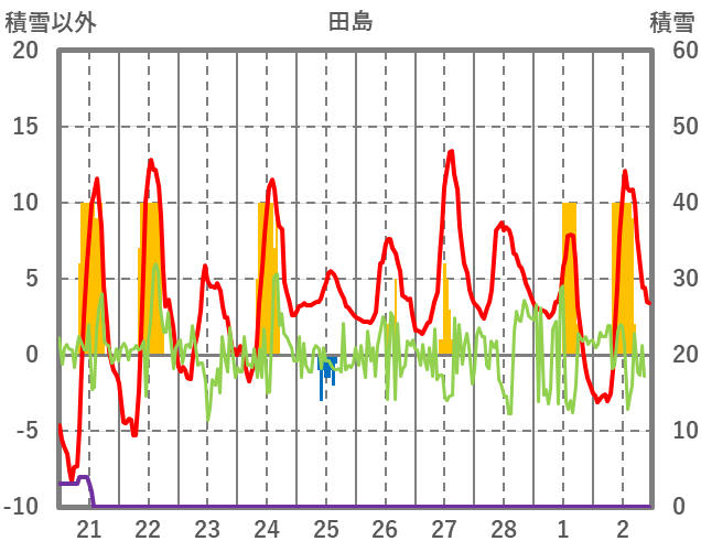 | 日 | 時 | 気温 | 降水 | 風向/風速 | 日照 | 積雪 | 降雪 |
