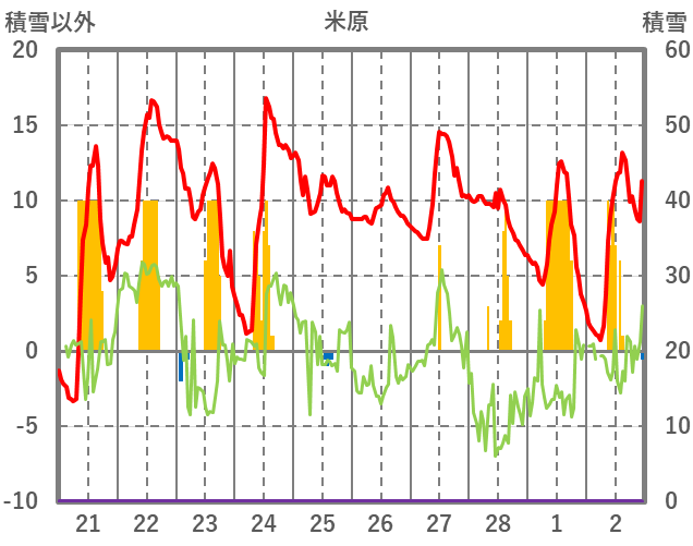 | 日 | 時 | 気温 | 降水 | 風向/風速 | 日照 | 積雪 | 降雪 |