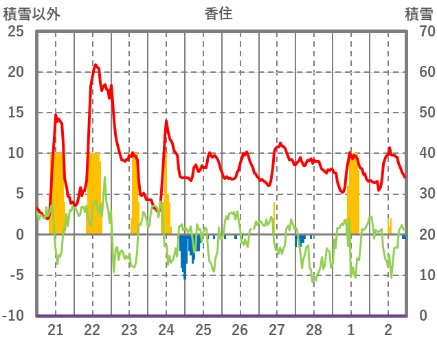 | 日 | 時 | 気温 | 降水 | 風向/風速 | 日照 | 積雪 | 降雪 |