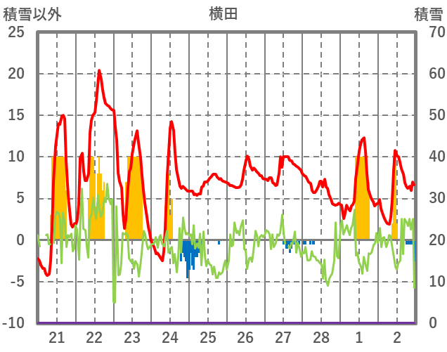 | 日 | 時 | 気温 | 降水 | 風向/風速 | 日照 | 積雪 | 降雪 |