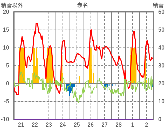 | 日 | 時 | 気温 | 降水 | 風向/風速 | 日照 | 積雪 | 降雪 |