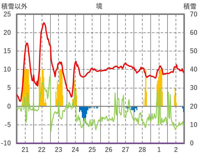 | 日 | 時 | 気温 | 降水 | 風向/風速 | 日照 | 積雪 | 降雪 |