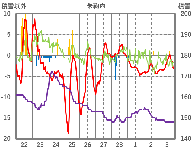| 日 | 時 | 気温 | 降水 | 風向/風速 | 日照 | 積雪 | 降雪 |