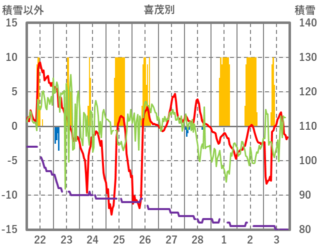 | 日 | 時 | 気温 | 降水 | 風向/風速 | 日照 | 積雪 | 降雪 |