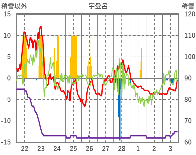 | 日 | 時 | 気温 | 降水 | 風向/風速 | 日照 | 積雪 | 降雪 |