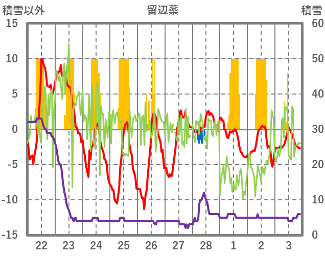 | 日 | 時 | 気温 | 降水 | 風向/風速 | 日照 | 積雪 | 降雪 |