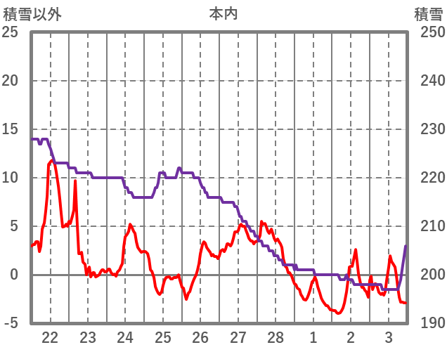 | 日 | 時 | 気温 | 降水 | 風向/風速 | 日照 | 積雪 | 降雪 |