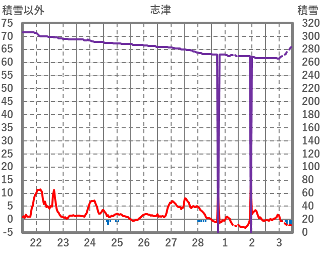 | 日 | 時 | 気温 | 降水 | 風向/風速 | 日照 | 積雪 | 降雪 |