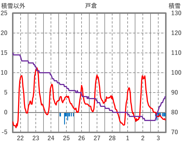 | 日 | 時 | 気温 | 降水 | 風向/風速 | 日照 | 積雪 | 降雪 |