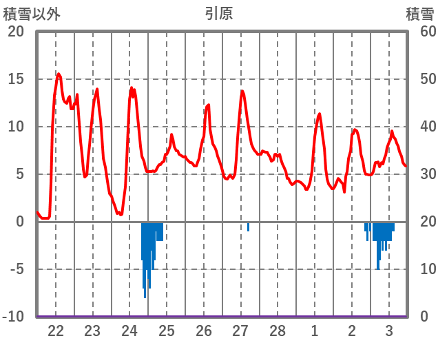 | 日 | 時 | 気温 | 降水 | 風向/風速 | 日照 | 積雪 | 降雪 |