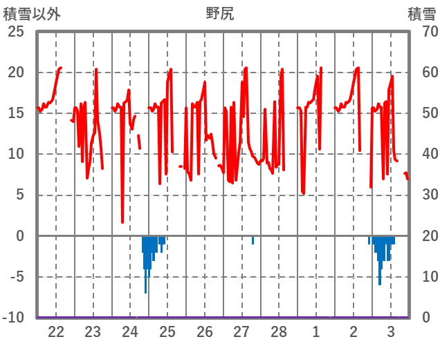 | 日 | 時 | 気温 | 降水 | 風向/風速 | 日照 | 積雪 | 降雪 |