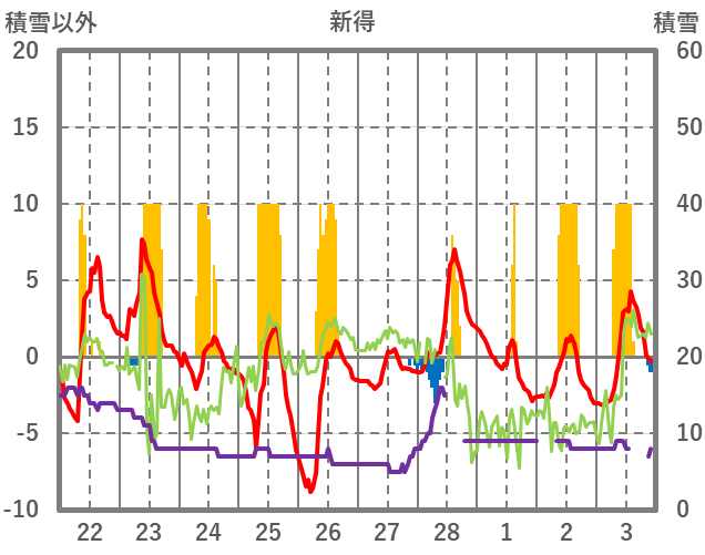 | 日 | 時 | 気温 | 降水 | 風向/風速 | 日照 | 積雪 | 降雪 |