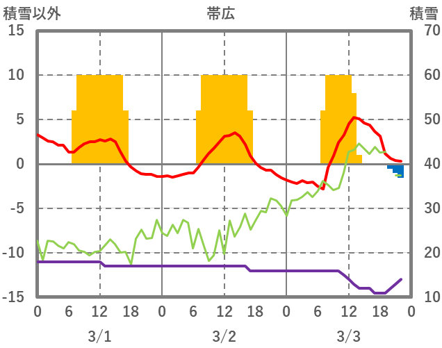 | 日 | 時 | 気温 | 降水 | 風向/風速 | 日照 | 積雪 | 降雪 |