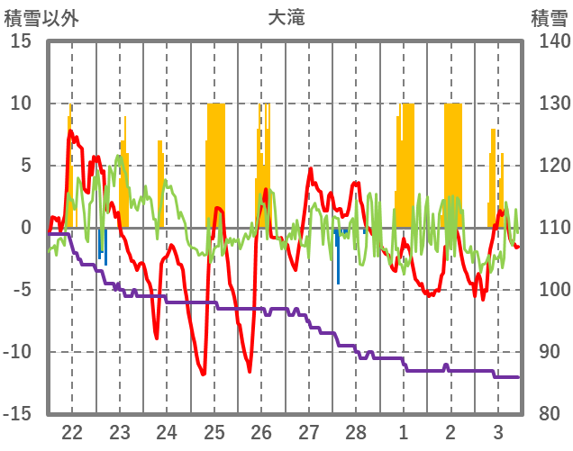 | 日 | 時 | 気温 | 降水 | 風向/風速 | 日照 | 積雪 | 降雪 |