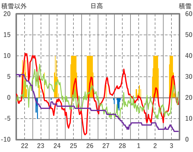| 日 | 時 | 気温 | 降水 | 風向/風速 | 日照 | 積雪 | 降雪 |