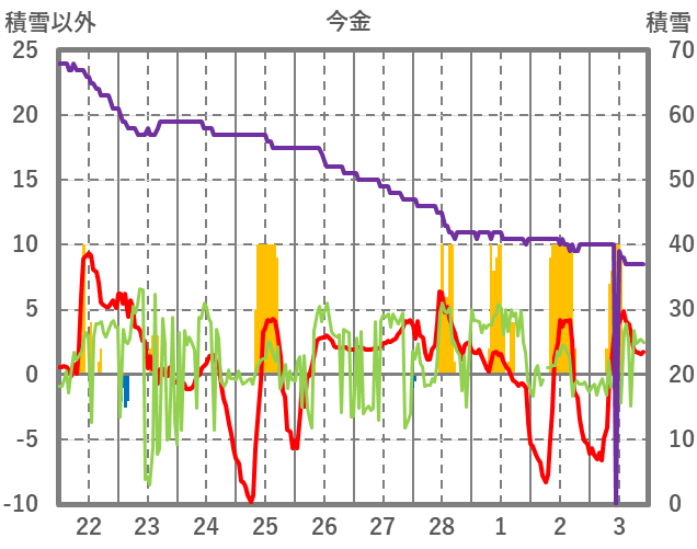 | 日 | 時 | 気温 | 降水 | 風向/風速 | 日照 | 積雪 | 降雪 |