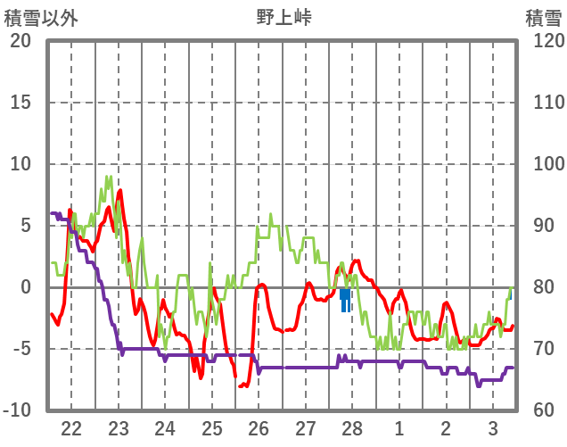 | 日 | 時 | 気温 | 降水 | 風向/風速 | 日照 | 積雪 | 降雪 |