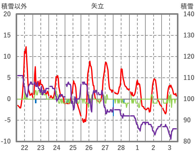 | 日 | 時 | 気温 | 降水 | 風向/風速 | 日照 | 積雪 | 降雪 |