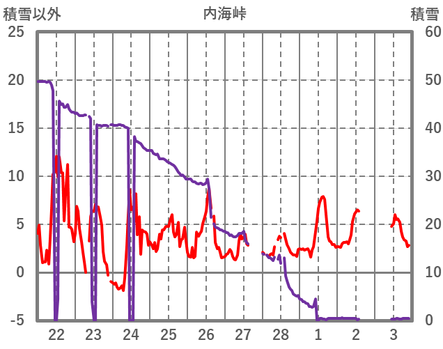 | 日 | 時 | 気温 | 降水 | 風向/風速 | 日照 | 積雪 | 降雪 |