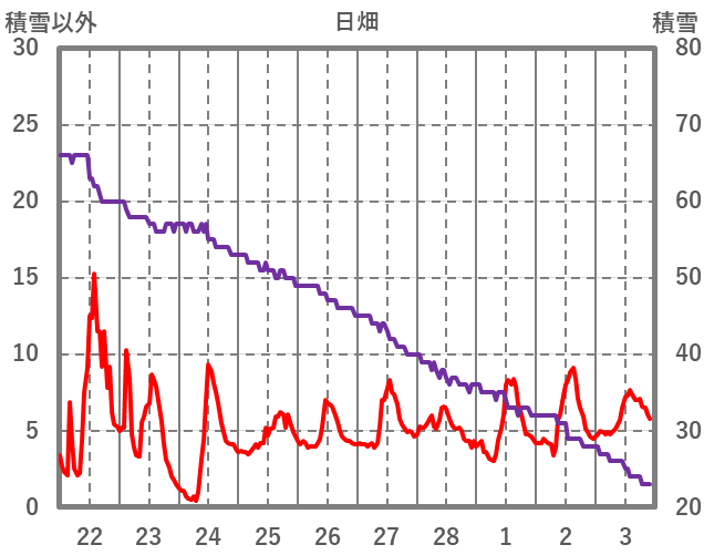 | 日 | 時 | 気温 | 降水 | 風向/風速 | 日照 | 積雪 | 降雪 |
