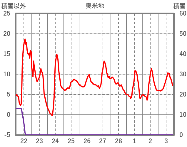 | 日 | 時 | 気温 | 降水 | 風向/風速 | 日照 | 積雪 | 降雪 |
