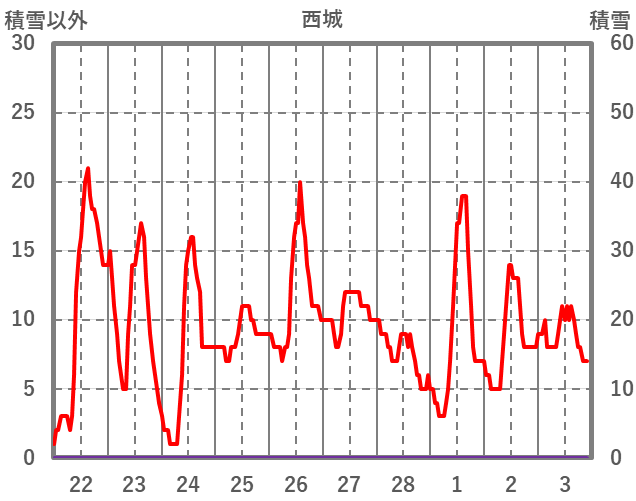 | 日 | 時 | 気温 | 降水 | 風向/風速 | 日照 | 積雪 | 降雪 |