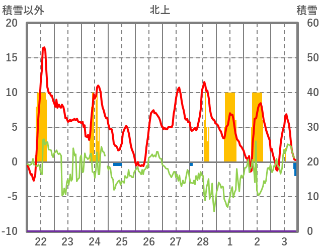 | 日 | 時 | 気温 | 降水 | 風向/風速 | 日照 | 積雪 | 降雪 |