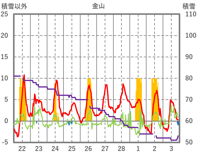 | 日 | 時 | 気温 | 降水 | 風向/風速 | 日照 | 積雪 | 降雪 |